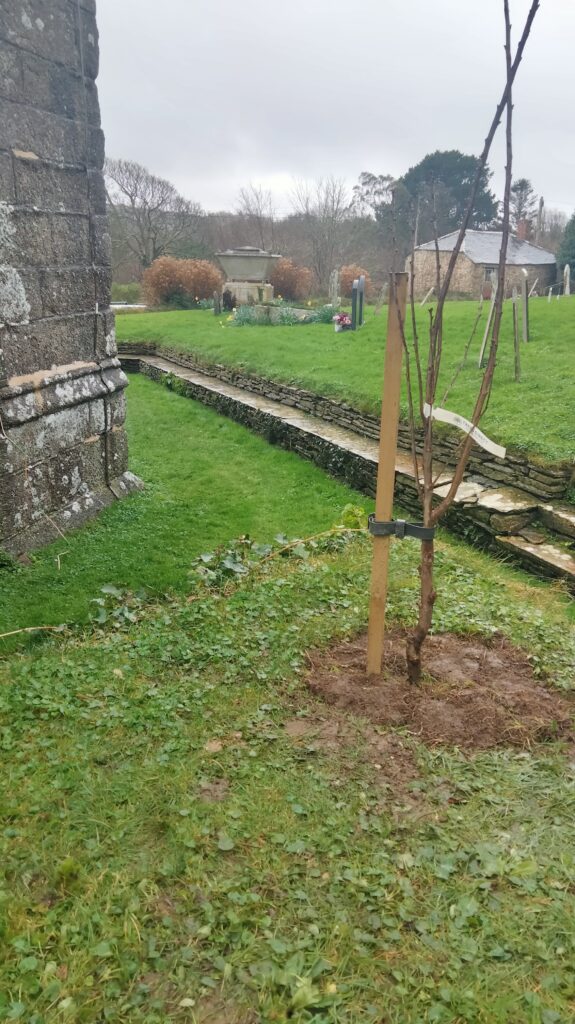Last week, I planted an orchard at a local church under the ‘Living Churchyard Project UK’ and the ‘Orchard Project UK’. Five fruit trees were delivered, which is the minimal amount of trees that creates an orchard. There were two apple trees, a pear, a cherry and a plum tree. Being a graveyard, bone meal was not required!